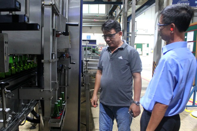 Ông Mẫn Hoàng Hữu, Giám đốc nhà máy đã dẫn khách hàng đi tham quan dây chuyền sản xuất, đặc biệt là khâu bảo quản phôi và đóng nắp chai. Theo vị quản lý, nhà máy có hệ thống kiểm tra và loại những chai bị lỗi như không có bia, dị vật bên trong, đóng nhầm nắp chai…