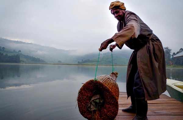 Nông dân đặt bẫy tôm hùm đất ở hồ Bunyonyi, Uganda. Từ năm 1978, tôm hùm đất được mang tới đây theo lệnh của nhà độc tài Idi Amin, hiện tại loài vật này đã thống trị hồ nước và toàn bộ các khu vực lân cận. Ảnh: Narratively.