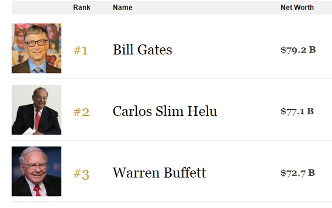 Nhà sáng lập Microsoft Bill Gates là người giàu nhất trên thế giới với tài sản ròng trị giá 79,2 tỷ USD.