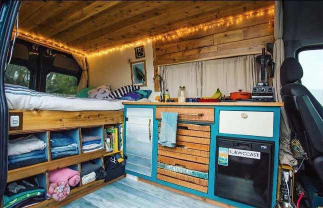 Chiếc xe van cũ ở bang California, Mỹ này đã được cải tạo thành một ngôi nhà di động trong 2 tuần. Không gian bên trong được bài trí gọn gàng với những nội thất làm từ gỗ đem lại cảm giác ấm cúng. Ảnh: Vanalog Vibes.