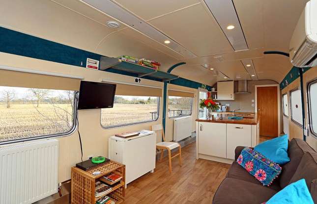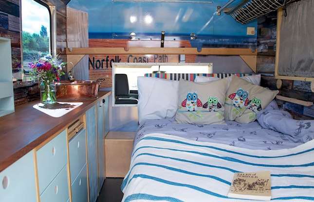 Chiếc xe cứu thương cũ của lực lượng không quân Hoàng gia Anh đã trở thành một ngôi nhà nghỉ dưỡng di động thú vị, đầy màu sắc. Nội thất bên trong được trang bị đủ để phục vụ cho một gia đình 4 thành viên. Ảnh: Quirky Campers.
