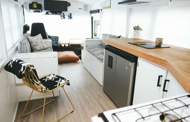 Một chiếc xe buýt chở học sinh đến trường đã được chuyển đổi thành ngôi nhà với phong cách bài trí nội thất tối giản pha lẫn các đường nét hiện đại của vùng Scandinavia. Với các tiện ích sinh hoạt đầy đủ, đây là tổ ấm của một gia đình với 6 thành viên. Ảnh: The Mayes Team.