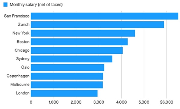 Theo đó, San Francisco (Mỹ) đã vượt Zurich (Thụy Sĩ) để giữ vị trí thành phố có mức lương cao nhất, với trung bình sau thuế hơn 6.500 USD một tháng. Xếp sau là Zurich (Thụy Sĩ), New York, Boston và Chicago (Mỹ).