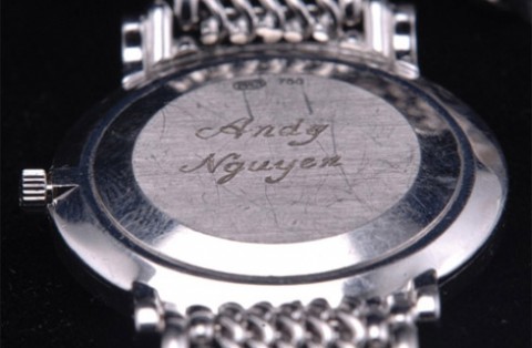 Chiếc đồng hồ có khắc tên người chủ ở mặt sau. Ảnh: Trần Việt Đức