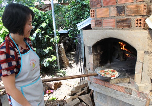 Theo James, yếu tố tạo nên tính độc đáo cho chiếc bánh pizza của ông chính là chiếc lò này. Nhờ nó, chiếc bánh pizza sẽ chín đều, nhanh, không quá béo, bề ngoài của bánh khô và dẻo, đặc biệt các loại thực phẩm chín đều mà vẫn giữ nguyên hương vị, màu sắc. Ngoài ra, chiếc lò cũng có thể dùng để nướng nhiều loại thức ăn. Tùy loại thực phẩm, người nướng có thể điều chỉnh nhiệt, độ nhanh chậm... Hiện tại vợ của James cũng đã có thể thay ông làm rất nhiều món, như gà nướng (loại gà thả vườn của người dân tộc bản địa) được sao tẩm gia vị theo cách riêng. Có những nhóm khách lại thích món sườn nướng ở đây nên thường đặt vợ chồng James quay cả con heo tộc vài chục kg. Vợ James cho biết thêm, ông còn có một món mà nhiều khách rất thích là khoai tây nướng. Khoai được rửa sạch, để nguyên vỏ luộc chín, sau đó cho vào khay tẩm một số loại gia vị bọc ngoài củ khoai và đem vào lò nướng thêm khoảng 2 phút là có thể đem ra dùng.