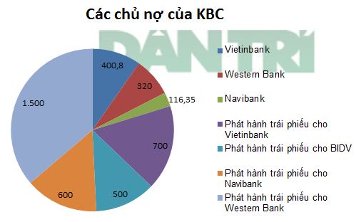 Báo cáo tài chính này cũng cho thấy, tại ngày 30/9/2012, KBC đang vay Western Bank 320 tỷ đồng với lãi suất 18%/năm. Công ty này cũng là “con nợ” của Ngân hàng TMCP Công thương Việt Nam (Vietinbank) với số tiền lên tới 400,8 tỷ đồng với lãi suất dao động 15-18%/năm và vay NHTMCP Nam Việt (Navibank) 116,35 tỷ đồng, lãi suất từ 21,1-22,7%/năm. Như vậy, công ty của ông Tâm đang vay dài hạn các ngân hàng con số khá lớn 837,15 tỷ đồng.