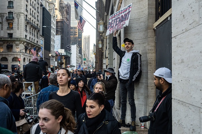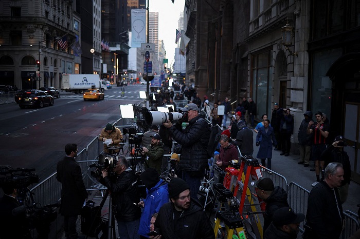 Phóng viên báo chí bên ngoài Tháp Trump vào sáng 4/4. Ảnh: Reuters