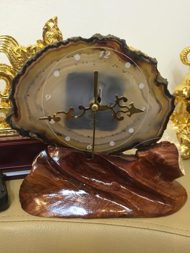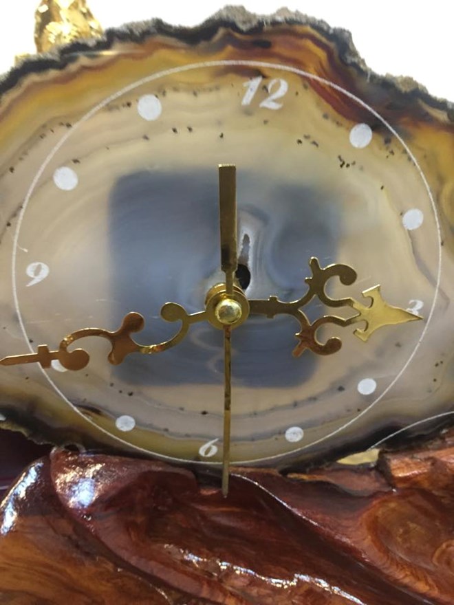 Chiếc đồng hồ được thiết kế với kiểu dáng ngộ nghĩnh đầy tính nghệ thuật trên chất liệu chính của mặt đồng hồ được làm từ đá Mã Não. Đây là một loại đá quý được sử dụng nhiều trong trang trí. Những chiếc kim để chỉ thời gian được phủ thêm một lớp vàng tạo sự nổi bật trên nền hoa văn của đá…. Chiếc đồng hồ này được đơn vị sản xuất ra bán với giá 2 triệu đồng.
