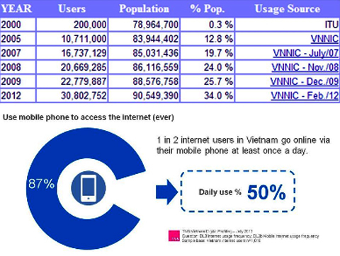 07/11/2012 11:12 AMNăm 2012 chứng kiến một đợt "sóng thần" về số lượng người dùng di động tại Việt Nam. Trong số hơn 30 triệu người dùng Internet, chiếm hơn 34% dân số, có tới 87% sử dụng Internet thông qua điện thoại di động, tăng gấp đôi so với tỷ lệ của năm 2011 (41%).