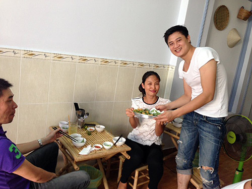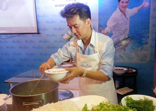 Mr Đàm tự tay nấu bún cá đãi khách trong dịp ra mắt thương hiệu Vua biển - Ảnh: Thiên Hương