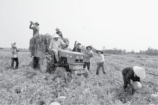 Được các “hiệp sĩ” nhận mua dưa hấu giúp, người dân thôn Mỹ Danh, xã Tịnh Hiệp, huyện Sơn Tịnh, Quảng Ngãi tất bật thu hoạch dưa hấu. Ảnh: N.B