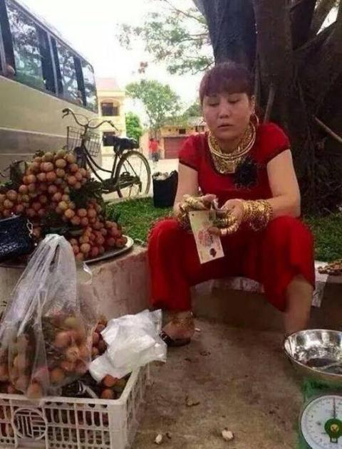 Hình ảnh một người phụ nữ trạc ngoài 40 tuổi mặc áo đỏ rực ngồi đếm tiền bên lề đường; tay chân và cổ đeo đầy vàng, bên cạnh là thúng vải khiến nhiều người xem... choáng váng.