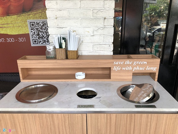 Có mặt tại Phúc Long Coffee & Tea Nguyễn Thị Minh Khai (quận 1, TP.HCM) sáng 24/9, Zing.vn ghi nhận hình ảnh cửa hàng phân loại rác thành 3 nhóm cơ bản: giấy, chất lỏng và nhựa.