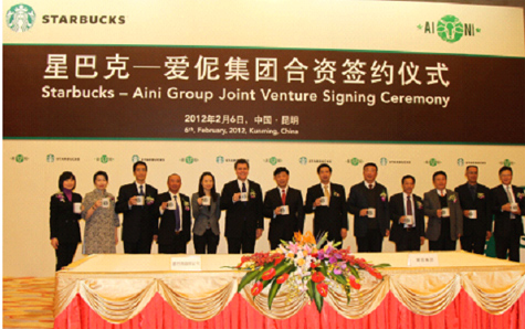 Một lưu ý quan trọng là sự phát triển này của Vân Nam đã có sự tham gia của Starbucks. Với Starbucks, nguyên tắc lý tưởng của họ là kiểm soát hoàn toàn chuỗi giá trị, từ vùng nguyên liệu đến rang xay, đóng gói và phục vụ ngay tại quán. Vì thế, sau nhiều năm thăm dò hợp tác, vào tháng 2/2012, Starbucks đã ký văn bản chính thức thành lập liên doanh với công ty trồng và chế biến cà phê Trung Quốc Ai Ni Group để thu mua và chế biến cà phê tại Vân Nam. Starbucks sẽ kiểm soát hoạt động của liên doanh này.
