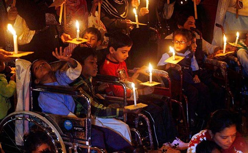 Những đứa trẻ tật nguyền bẩm sinh - thế hệ thứ hai chịu ảnh hưởng từ thảm họa Bhopal - đang thắp nến tưởng nhớ đến những nạn nhân đã thiệt mạng. (Ảnh: Rajeev Gupta/AP)