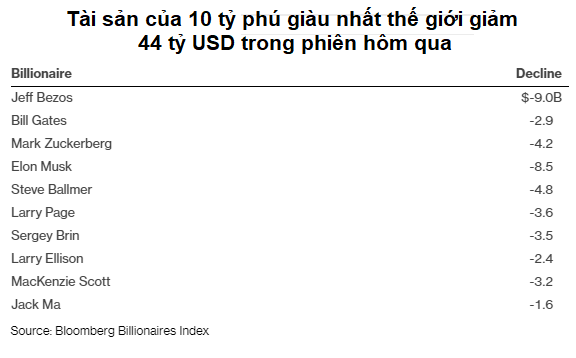 Người mất nhiều tiền nhất là nhà sáng lập Jeff Bezos của tập đoàn Amazon, với mức giảm 9 tỷ USD vì cổ phiếu của gã khổng lồ thương mại điện tử giảm mạnh nhất kể từ tháng 6. Tài sản ròng của Elon Musk cũng giảm 8,5 tỷ USD với cổ phiếu Tesla đã chạm gần mức giảm 20% sau 3 phiên giảm liên tiếp.