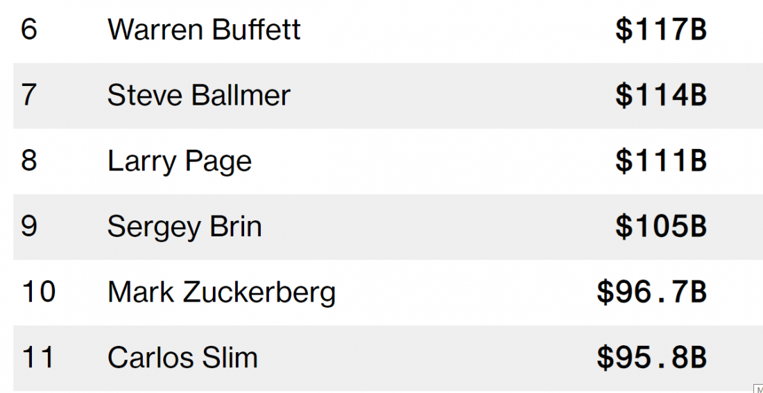 Hiện tại, dù đang xếp vị trí thứ 10 trong danh sách những người giàu nhất thế giới của Bloomberg, tài sản của ông chủ Meta đang kém xa hai người dẫn đầu thế giới là Elon Musk (221 tỉ USD) và Bernard Arnault (189 tỉ USD). Trong khi đó, người đang xếp sau ông là tỉ phú Mexico - Carlos Slim với tài sản 95,8 tỉ USD.