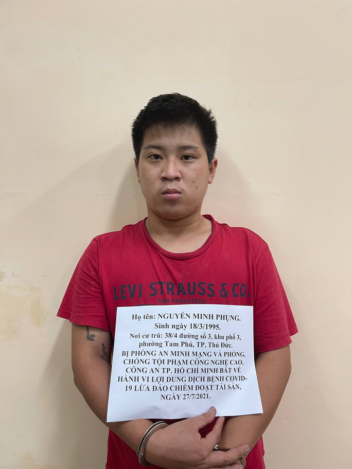 Ngày 29-7, Phòng An ninh mạng, phòng chống tội phạm sử dụng công nghệ cao phối hợp với Công an TP Thủ Đức (TP HCM) bắt giữ đối tượng Nguyễn Minh Phụng (25 tuổi, ngụ phường Tam Phú, TP Thủ Đức) để làm rõ, xử lý hành vi lợi dụng tình hình dịch bệnh để đăng tải các thông tin cung ứng lương thực, nhu yếu phẩm, dược phẩm, tổ chức dịch vụ tiêm vắc-xin phòng dịch Covid-19 nhằm lừa đảo, chiếm đoạt tài sản.