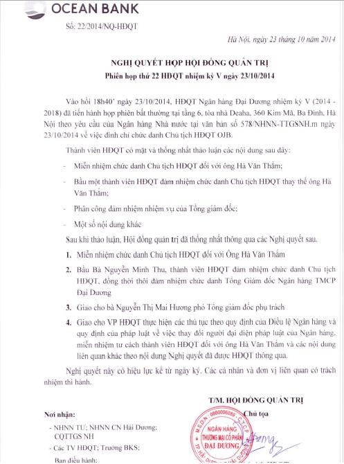 Nghị quyết của HĐQT OceanBank đã được NHNN chấp thuận và NHNN chính thức ra thông cáo vào ngày 24.10.2014.