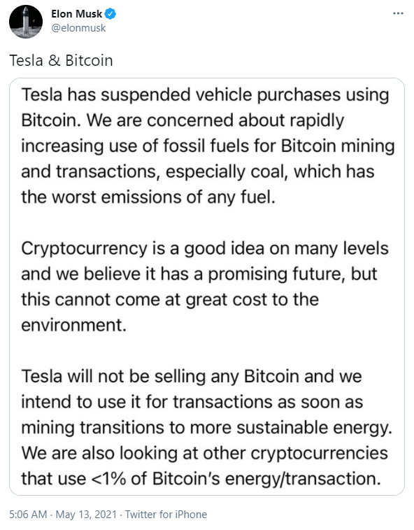 Nguyên văn phát biểu của Tesla như sau: "Chúng tôi lo ngại về việc sử dụng nhiên liệu hóa thạch để khai thác và giao dịch Bitcoin ngày càng gia tăng, đặc biệt là than, loại nhiên liệu có lượng phát thải tệ nhất trong số các nhiên liệu".