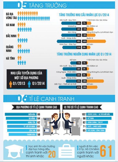 So với cùng kỳ năm 2013, nhu cầu tuyển dụng nhân sự trong quý I/2014 tăng trưởng 11%, trong khi nguồn cung lao động cũng tăng nhưng ở mức chậm hơn là 8%. Tuy nhiên, dịch chuyển trong thị trường nhân lực về các nhóm cấp bậc vẫn chưa cân bằng.