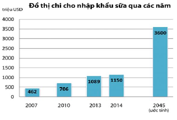 Quy mô thị trường lớn như vậy, nhưng tổng số bò sữa trong nước hiện tại cũng chỉ ở mức khoảng 240.000 con, đáp ứng được 30% nhu cầu sữa tươi nguyên liệu trong nước. Hơn 2/3 lượng sữa nguyên liệu còn lại đều được nhập từ các nước khác, chủ yếu dưới dạng sữa bột. Hiện, VN đang là một trong 20 nước nhập khẩu sữa lớn nhất thế giới. Dự kiến năm 2015 VN sẽ phải bỏ ra 1,1 tỷ USD để nhập 1,5 triệu tấn sữa các loại. Tốc độ nhập khẩu sữa trung bình hàng năm tăng 15%. Sự thiếu hụt nguồn cung trong nước cũng đã đẩy giá thu mua sữa tươi nội địa tăng liên tục từ năm 2003-2014 với tốc độ trung bình 12% mỗi năm. Dự báo của Bộ Nông nghiệp và Phát triển Nông thông cho biết, VN vẫn thiếu hụt nguồn sữa nguyên liệu trong vòng 10 năm tới, mặc dù nhu cầu hiện nay chỉ ở mức 1,3 tỷ lít.