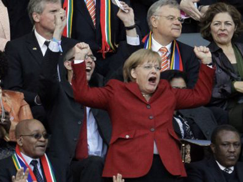 Thủ tướng Đức Merkel phấn khích khi Đức ghi bàn trong trận tứ kết World Cup 2010 trước Argentina tổ chức tại Nam Phi. Ảnh: AP