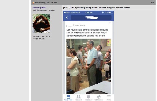 Hình ảnh ông Lý Hiển Long mặc áo phông cùng chiếc quần kaki bình thản chờ xếp hàng mua gà rán tại cửa hàng số 85 trung tâm ăn uống Redhill đã được một người dân chụp lại và đưa lên mạng.