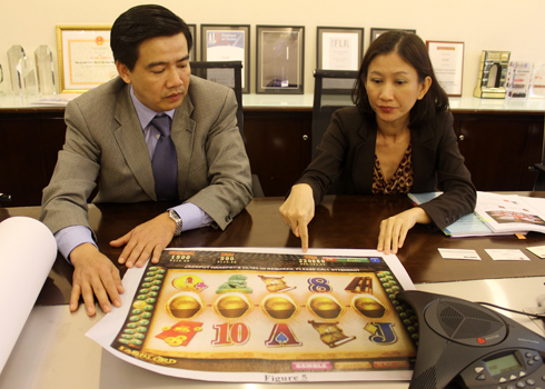 | Đại diện pháp lý của Công ty Đại Dương cho rằng mẫu trò chơi trúng thưởng phải có biểu tượng giống nhau xếp thành hàng như trong ảnh và ô "win" mà nữ luật sư chỉ trong hình phải hiển thị số tiền thưởng chứ không thể bằng 0. Ảnh: Vũ Lê |