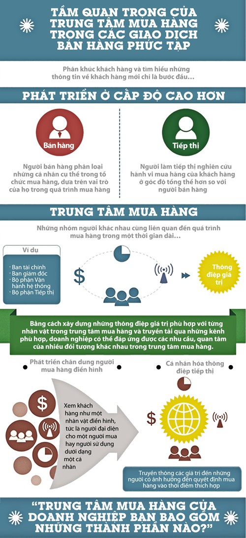 Trung tâm mua hàng được hiểu là một nhóm người có liên quan đến một giao dịch mua hàng phức tạp và kéo dài trong một thời gian. Mỗi người trong trung tâm mua hàng sẽ có những vai trò, yêu cầu và mong muốn khác nhau đối với một giải pháp do bên bán hàng đưa ra. Chẳng hạn, đối với một công ty viễn thông đang có nhu cầu mua một phần mềm mới, trung tâm mua hàng có thể bao gồm các nhân sự từ bốn nhóm khác nhau: ban giám đốc, bộ phận tài chính, bộ phận tiếp thị và bộ phận vận hành hệ thống.