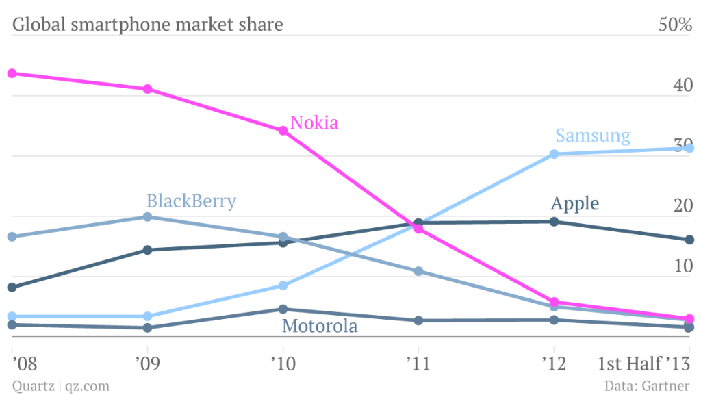 Như thể, Apple vẫn giữ suy nghĩ ở trên đỉnh thị trường, trong khi thị phần của hãng ngày càng thụt lùi so với Android. Ở một khía cạnh khác, “kẻ báo thù” Nokia đang là tâm điểm của dòng Windows khi kéo thị phần Windows Phone lên ngang ngửa thị phần iOS tại một số quốc gia châu Âu.