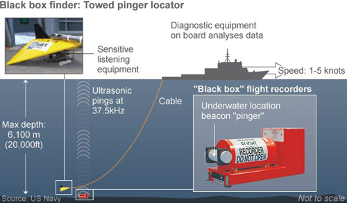 Đồ họa cho thấy cách thức tìm hộp đen (màu cam) của tàu Ocean Shield và thiết bị dò tín hiệu TPL-25 (màu vàng) dưới mặt nước biển. Độ sâu tối đa của đáy biển là 6.100 mét. Tần số của các tín hiệu hộp đen theo thiết kế là 37,5 kHz. Đồ họa: US Navy |