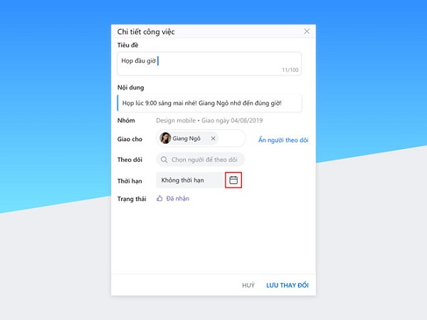 Khi nhấn vào biểu tượng thêm việc trên thanh công cụ, Cửa sổ “Giao công việc mới” hiện ra với các trường thông tin cần thiết như Tiều đề, Nội dung, Người được giao việc, Thời hạn... Zalo cũng cho phép nhắc nhở các thành viên cập nhật nhanh tiến độ mà không cần gõ trực tiếp vào nhóm chat, giúp quản lý nhóm thông minh và tiết kiệm khá nhiều thời gian.
