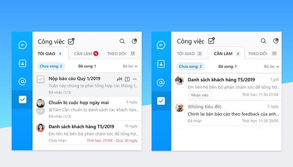 Danh sách công việc chia theo từng mục: Tôi giao, cần làm, việc đang theo dõi.