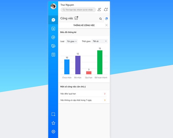 Zalo đồng thời cung cấp công cụ thống kê dưới dạng biểu đồ theo các mức độ: chưa nhận việc, đã nhận việc, đã quá hạn, đã xong…
