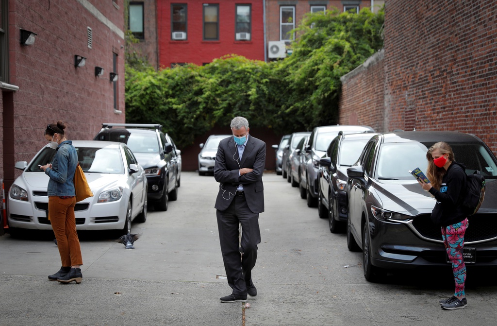Thị trưởng New York Bill de Blasio đứng xếp hàng chờ bỏ phiếu sớm ở Brooklyn. Ảnh: Reuters.
