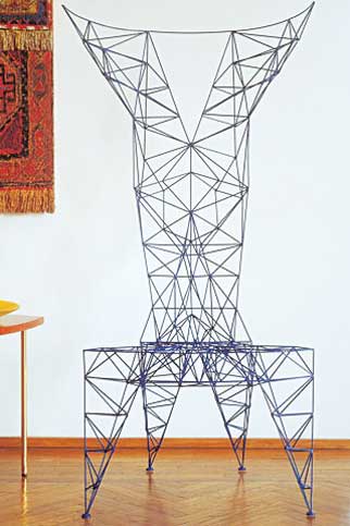 Ghế Pylon - Đúng như tên gọi Pylon (có nghĩa là ngọn tháp), chiếc ghế của Tom Dixon có kết cấu đan xen cao ngất ngưởng. Được ghép bằng những thanh thép mỏng và hỗ trợ đắc lực bởi kỹ thuật hàn tinh vi, ghế có khả năng chịu lực lớn dù kiểu dáng cực kỳ mảnh mai. Tác phẩm vĩ đại này được sản xuất toàn bộ bằng tay và là thiết kế yêu thích của Tom Dixon cho hãng Cappellini vào năm 1992. Có người nói Pylon là phiên bản nội thất của biểu tượng Effiel nước Pháp, người khác lại cho rằng trông chiếc ghế y hệt đường dây của một cột điện cao thế. Có rất nhiều nhận xét khác nhau xoay quanh chiếc ghế này, nhưng tất cả đều đồng ý rằng Pylon là một tác phẩm nội thất thú vị nhất mà họ từng thấy. |