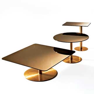 Bàn Flash - Tám năm sau ngày bộ sưu tập đèn biểu tượng Mirror Ball ra đời, những chiếc bàn Flash xuất hiện trên thị trường để hoàn thiện ý tưởng phát triển dòng sản phẩm nội thất phản quang của Tom Dixon. Mặt bàn là một tấm gương đồng láng bóng với chân bàn làm bằng thép mạ đồng thau, nhằm nhân đôi hiệu quả phản chiếu ánh sáng. |