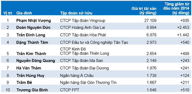 Nay cộng thêm giá trị tài sản của bà Phạm Thu Hương (vợ ông Vượng), bà Phạm Thúy Hằng (em bà Hương), bà Phạm Hồng Linh (chị bà Hương), ông Phạm Nhật Vũ (em trai ông Vượng) và ông Nguyễn Quốc Thành (chồng bà Hằng) khiến cho đại gia đình ông Phạm Nhật Vượng trở thành đối thủ “nặng ký” nhất với khối tài sản “khủng” là 27.109 tỷ đồng.