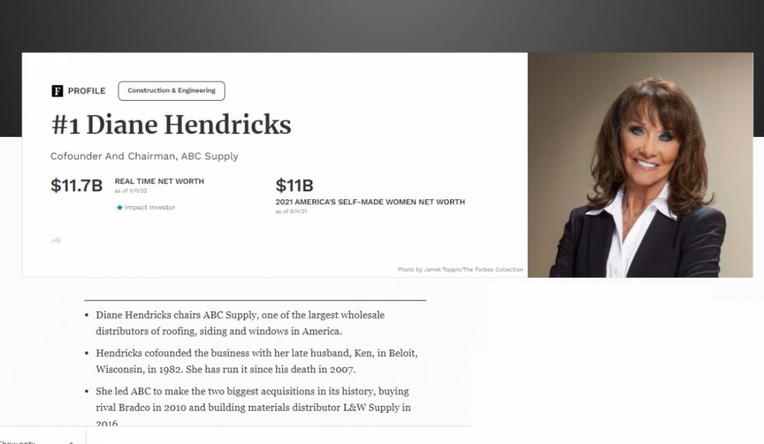 Nữ tỷ phú tự thân giàu nhất nước Mỹ là bà Diane Hendricks - nhà đồng sáng lập kiêm chủ tịch của ABC Supply - một trong những công ty hàng đầu về tấm lợp.