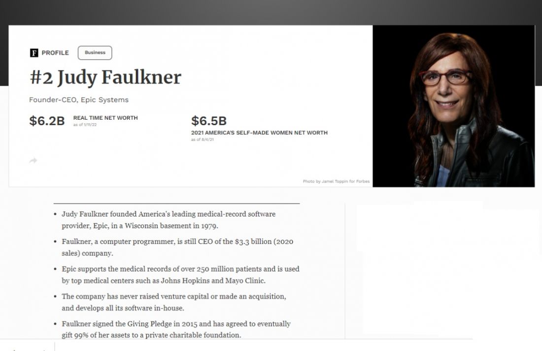 Người đứng vị trí thứ 2 là bà Judy Faulkner - nhà sáng lập kiêm CEO của hãng công nghệ y tế Epic Systems, với tài sản ước tính lên tới 6,2 tỷ USD.