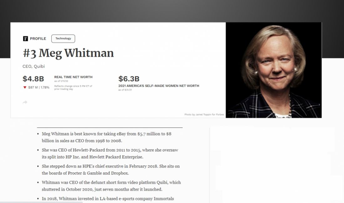Bà Meg Whitman - CEO của eBay và ứng dụng giải trí Quibi - được xếp thứ 3 trong bảng xếp hạng tỷ phú tự thân giàu nhất nước Mỹ với tài sản trị giá 4,8 tỷ USD.