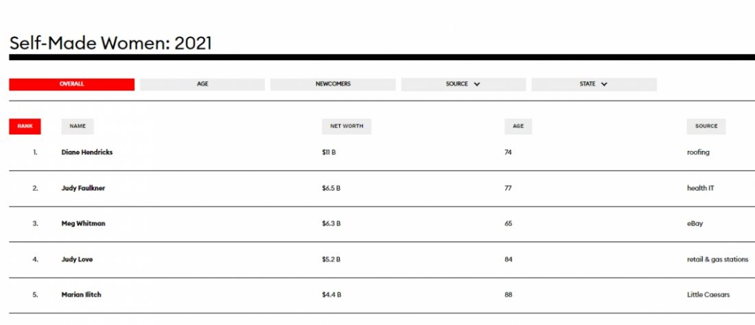 Forbes vừa vinh danh những nữ tỷ phú tự thân giàu nhất nước Mỹ. Tài sản của những phụ nữ tự thân giàu nhất nước xứ sở cờ hoa đã tăng 31% trong bảng xếp hạng mới nhất của Forbes, lên mức 118 tỷ USD, trong bối cảnh thị trường chứng khoán bùng nổ.