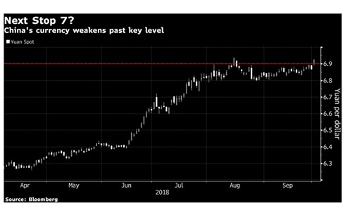 Tiền tệ của Trung Quốc đang suy yếu, thể hiện qua bảng theo dõi đồng nhân dân tệ so với USD trong 6 tháng gần đây (từ tháng 4-9/2018). (Nguồn: Bloomberg)