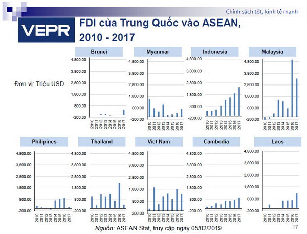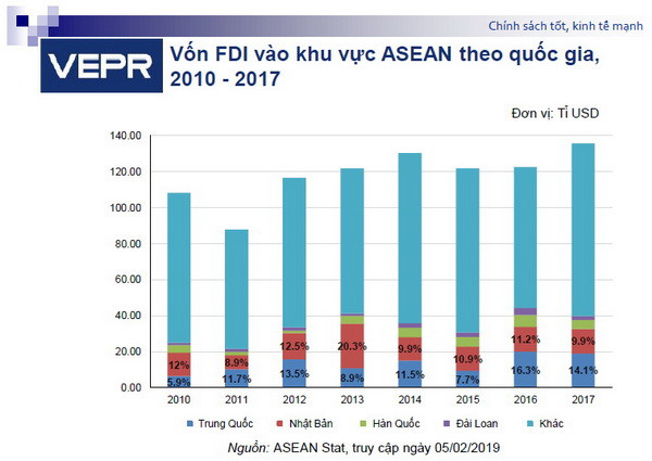 Xét đến vốn FDI vào khu vực Đông Nam Á, sau khoảng thời gian khiêm tốn khi mà đầu tư Trung Quốc chiếm 5,9% tổng đầu tư vào Đông Nam Á, rất thấp so với tỷ trọng 12% của Nhật, qua nhiều biến động thì đến năm 2016, xu thế mới bắt đầu nổi lên.
