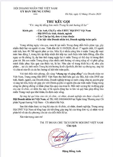 Với tinh thần tương thân tương ái, “lá lành đùm lá rách”, sẵn sàng “chung tay vì cộng đồng” của doanh nhân trẻ Việt Nam, Trung ương HDNTVN tha thiết kêu gọi các Hội, hội viên DNT các tỉnh, thành, ngành, các danh nhân, doanh nghiệp trong cả nước cùng chia sẻ, quyên góp và ủng hộ tiền, hiện vật, cùng góp sức với Chính quyền và người dân các tỉnh miền Trung trong công tác phòng chống và khắc phục hậu quả do mưa lũ. Mỗi một sự ủng hộ và đóng góp của các tổ chức, cá nhân lúc này sẽ là nguồn động lực to lớn và quý báu giúp đồng bào miền Trung vượt qua khó khăn, ổn định cuộc sống”.