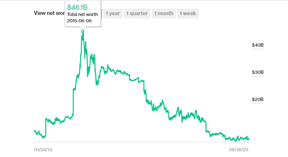 15/06/2023 2:47 PMWang Jianlin, người sáng lập Tập đoàn Dalian Wanda, từng là người giàu nhất châu Á với tài sản 46,1 tỉ USD, nhưng hiện tại ông chỉ còn 6,62 tỉ USD và xếp thứ 357 trong danh sách tỉ phú của Bloomberg.