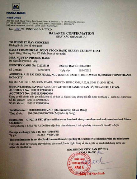 | Giấy xác nhận số dư tiền gửi 100 tỉ đồng của ông Dũng, do Ngân hàng Nam Á phát hành. Ảnh: Đ.A |