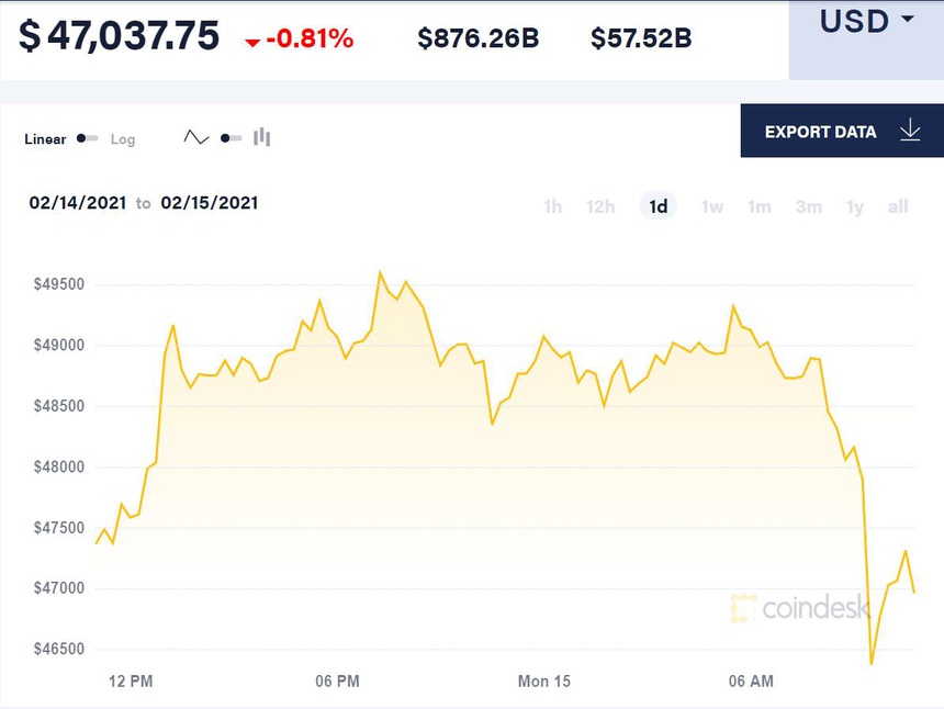 Giá Bitcoin đang đứng ở mức trên 47.000 USD/đồng. Ảnh: Coin Desk.