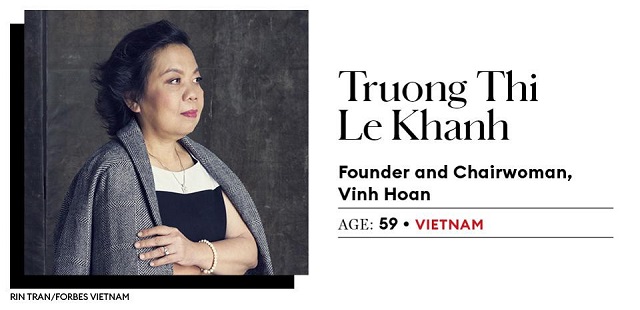 15/09/2020 1:10 PMBà Trương Thị Lệ Khanh – Chủ tịch CTCP Vĩnh Hoàn và bà Nguyễn Bạch Điệp – Chủ tịch FPT Retail lọt danh sách 25 nữ doanh nhân quyền lực nhất châu Á năm 2020.